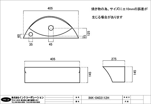 ●陶器製品寸法には公差がございます。 ●蛇口・台は別途でのご購入となります。 ●レバー式排水栓は使用出来ませんので、ご注意ください。 ●取付工事は弊社でも承っておりますので、 お気軽にご相談くださいませ。 または お近くの工務店様にご相談くださいませ。 ●プッシュアップ式排水栓1個が付属します。 【 サイズ:W405*D275*H145】 【 水栓取付穴:直径35mm】 【素材:陶器】 【重量:約6.4kg】 【水量:約2.42L】