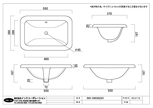 ○陶器製品寸法には公差がございます。 ○蛇口・台は別途でのご購入となります。 ○レバー式排水栓は使用出来ませんので、ご注意ください。 ○取付工事は弊社でも承っておりますので、 お気軽にご相談くださいませ。 または お近くの工務店様にご相談くださいませ。 ●プッシュアップ式排水栓1個が付属します。 【サイズ:W550*D380*H187】 【素材:陶器】 【水栓取付穴:35mm】