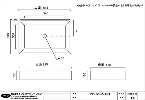 ●陶器製品寸法には公差がございます。 ●蛇口・台は別途でのご購入となります。 ●レバー式排水栓は使用出来ませんので、ご注意ください。 ●取付工事は弊社でも承っておりますので、 お気軽にご相談くださいませ。 または お近くの工務店様にご相談くださいませ。 ●プッシュアップ式排水栓1個が付属します。 【サイズ:W615*D410*H105】 【素材:陶器】 【重量:約14.48kg】 【水量:約15.8?】