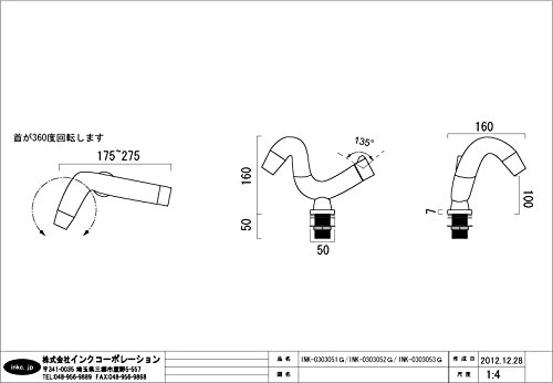 【サイズ】 幅:230~275mm 奥行き:160mm 高さ:160mm 吐水口高さ:100mm 【素材】 銅合金 【セット内容】 ・本体 ・フレキパイプ2本 ・取付金具 【取り付けについて】 取付工事は弊社でも承っておりますので、お気軽にご相談くださいませ。 または お近くの工務店様にご相談くださいませ。 【備考】 ・日本規格に適合致します。 ・在庫が無い場合、ご注文から納品まで約1ヶ月から1ヶ月半程、 お待ち頂く場合がございます。 ・こちらの商品は混合水栓となっております。 ・水栓取付穴は35mm開けて下さい。 ■ご不明な点などございましたらお気軽に当社までお問い合わせ下さいませ。