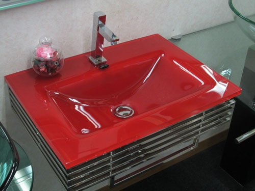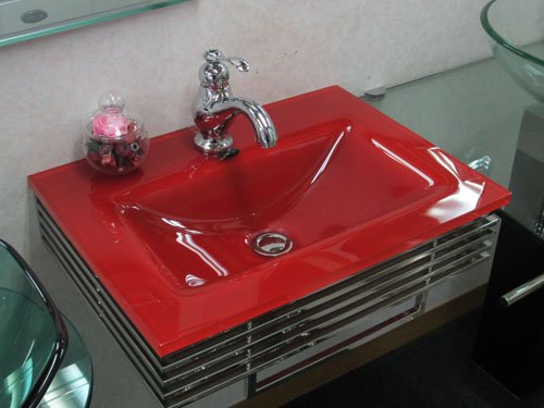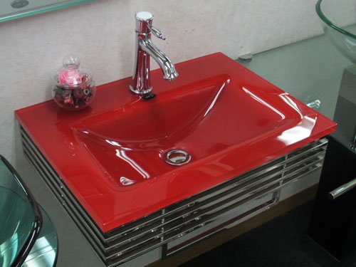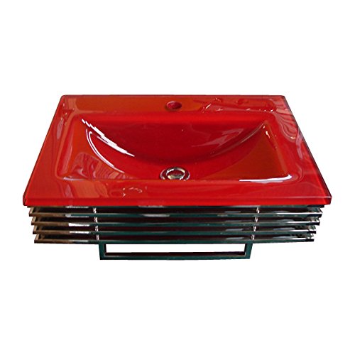 洗面台 洗面化粧台 「強化ガラス製洗面ボウル+ステンレス台+プッシュ式排水栓」の3点セット レッド 幅55cm KY-6042set-red