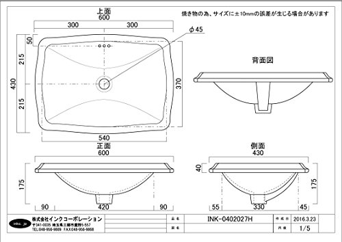 洗面ボウル 陶器 オーバーカウンタータイプ 埋め込み スクエア 幅60cm INK-0402027H