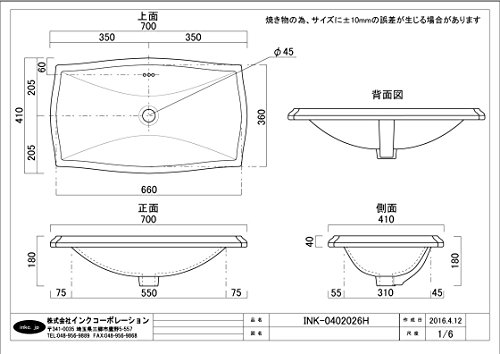 洗面ボウル 陶器 オーバーカウンタータイプ 埋め込み スクエア 幅70cm INK-0402026H