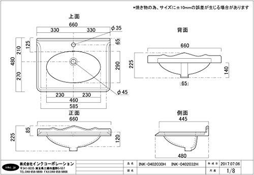 洗面ボウル 陶器 オーバーカウンタータイプ 埋め込み スクエア 幅66cm INK-0402030H