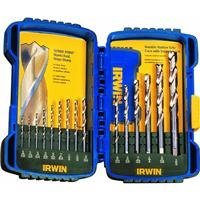Product Description Turbo point for no slip starting on hard materials, prevents walking of drill bit. Gold oxide coating for additional corrosion resistance. Can be used for drilling in metal, wood, or plastic. Jobber length. Set includes: (2) 1/16'', 5/64'', (2) 3/32'', 7/64'', (2) 1/8'', 9/64'', 5/32'', 3/16'', 7/32'', 1/4'', 5/16'', 3/8'', and plastic case. Amazon.com The Irwin Turbomax 15-Piece Turbo Point Bit Set is a standard 118 degree point collection for use in drilling wood, metal, and plastic. The included bits are constructed of M-2, 8 percent cobalt, high-speed steel for the best combination of strength, heat resistance, and wear resistance. Other features include a sliding latch design for added security, and a durable rubber-sided case for added impact resistance. What's in the Box Two 1/16-, 5/64-, two 3/32-, 7/64-, two 1/8-, 9/64-, 5/32-, 3/16-, 7/32-, 1/4-, 5/16-, and 3/8-inch turbo point bits. See all Product Description
