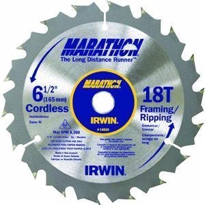 Silicone coat allows the blade to slice easier through material reducing pitch and resin buildup when cutting pressure-treated lumber. Construction-grade carbide teeth deliver longer blade life. Every other tooth is thinner for faster cuts. The innovative heat vent/expansion slot design reduces vibration for longer life and straighter cuts. Plate is fully hardened to run truer, longer. 18 tooth count blades are best for use with medium-thickness metals. IRWIN Tools MARATHON Carbide Cordless Circular Saw Blade, 6 1/2-inch, 18T (24020)