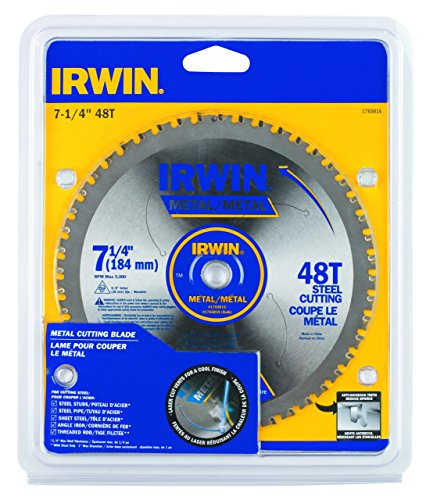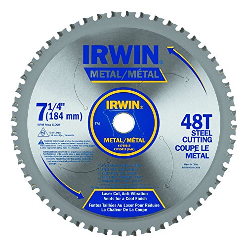 48 teeth. Metal Cutting Grade Carbide Tooth reduces wear, withstands impact & delivers longer life. Laser Cut Blade provides for stronger tooth bond. Laser Cut Anti-Vibration Vents that stabilizes the blade and keeps it cool for smooth & accurate cuts. Anti Kick Back Shoulder reduces dust & sparks for safer cuts. These IRWIN Metal-Cutting Circular Saw Blades are laser-cut and feature anti-vibration vents to keep the blade cool for smooth and accurate cuts. Their metal cutting-grade carbide teeth withstand impact, reduce wear and deliver longer life. The anti-kickback tooth shoulder helps ensure consistent cuts. These IRWIN saw blades have 48 teeth and a 7-1/4-inch diameter.