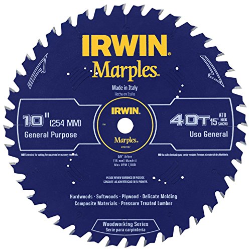 Heat Resistant Non-stick coating reduces gumming for easy cleanup and truer, cleaner cuts. The Irwin Tools 1807367 Marples Laser Cut 10-Inch 40-Tooth Alternate Tooth Bevel Circular Saw Blade is part of a full line of fine woodworking saw blades that are manufactured in Italy to the highest standards of precision required for fine woodworking and finish carpentry. These industry-leading laser-cut, thin kerf saw blades are produced in a highly-automated, state-of-the-art facility in Udine, Italy - the heart of high-quality circular saw blade manufacturing. Engineered with oversized, high-quality carbide, the new Marples Woodworking Series saw blades provide the extended life and flawless finish professional woodworkers and finish carpenters demand. The blades are precision tensioned for flawless cuts. They also feature a heat resistant, non-stick coating that has an Aluminum Matrix added to it to dissipate heat for easy clean up and truer, cleaner cuts. The 10-Inch 40-Tooth blade features an alternate top bevel where the teeth alternate between a right and left bevel to form a knife like edge on either side for a cleaner cut. This blade is ideal for general purpose cutting on a table saw or miter saw. The 10-Inch 40-Tooth blade works great on hardwoods, softwoods, composite materials and pressure treated lumber.