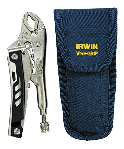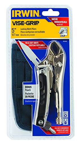 Style:5CR with case The IRWIN VISE-GRIP Locking Multi-Pliers with Pouch, Curved Jaw, feature the legendary locking pliers performance tradesmen have trusted since 1924.? Constructed of high-grade, heat-treated alloy steel, it has an innovative curved jaw design that provides maximum torque on multiple surface shapes including round pipe, square or hex bolts, and more. Pressure and fit is adjustable with just the turn of a screw while the guarded trigger release can be engaged with only one hand for increased versatility. The 5WR Locking Multi-Pliers include a fold-out stainless steel serrated knife blade, a fold-out screwdriver including a ?” bit holder with 6-8 slotted and #2 Phillips bits. This 4-tools-in-1 design allows users to carry fewer tools on the job inside the durable canvas carrying pouch with belt loop and a hook-and-loop secured cover.