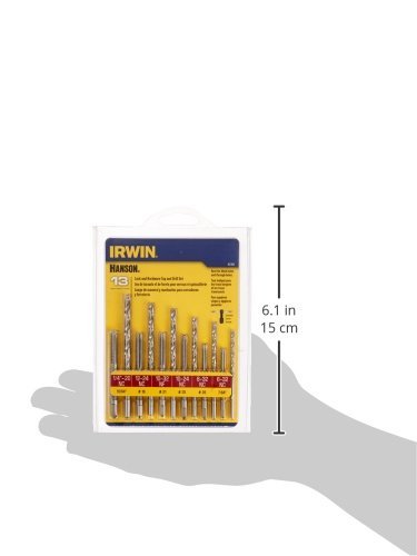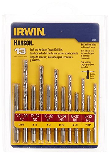 Includes a plastic storage case. These drill and tap combinations produce a thread that is strong and easy to tap. 135-Degree split point HSS drill bits ensure fast, precise drilling. High carbon steel plug taps are ideal for general purpose threading. Includes plastic storage case. This IRWIN HANSON 13-Piece Tap and Drill Bit Set features drill and tap combinations that produce a thread that is strong and easy to tap. The high-carbon steel plug taps are great for general-purpose threading, while the 135° split-point drill bits help give fast, precise drilling. The drill bit set includes a plastic storage case.