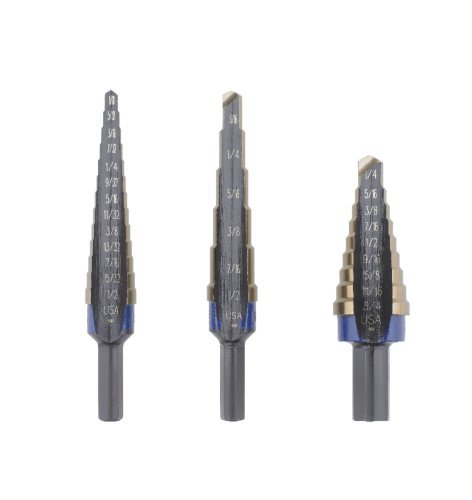Includes #1C, #2C and #3C bits. Single-flute cutting edge for greater control through steps. 3 Flatted shank prevents slipping in drill chuck. Non-skid self-starting tip eliminates skidding and the need for center punching.. Laser marked sizes. 3-flatted shank. This IRWIN Unibit Cobalt Step Drill Bit Set is engineered with M-35-grade cobalt steel for maximum life when drilling in tough steel. The SpeedPoint tip design provides fast starts and features laser-marked sizes for easy reading. The radial concave flute design helps ensure an effective use of drilling power.