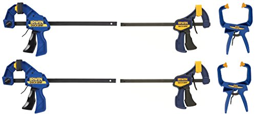 - Includes (2) 12-inch quick-change bar clamps, (2) 6-inch mini bar clamps, and (2) 2-inch spring clamps.