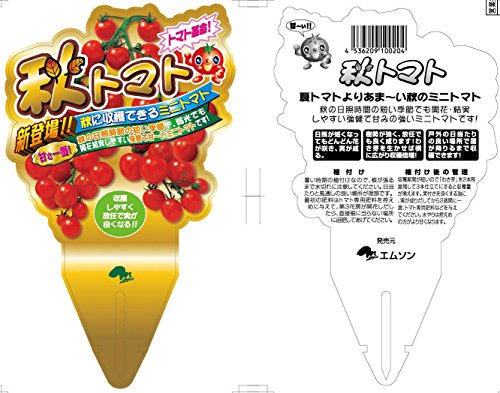・少し涼しくなった9月に植えて秋に収穫できるミニトマトです。 ・寒冷地以外では9月末頃まで植付け可能です。 ・秋の日照時間の短い季節や、弱光線でも開花結実しやすい強健な品種です! ・プランターでも簡単に栽培できます。 ・植付けから収穫開始までは、約50日です。(収穫時期は毎年の気候などにより多少変わります) ・育て方 育て方は普通のミニトマトと同じです。植付け時期が暑い時期ですので、しっかり土に根が張るまで水切れに注意してください。1段目に実をつけることがポイントです。1段目に実がついたら、その上の段も自然に実がつきます。元肥は控えめにして、実がついて少し肥大し始めた頃に1回目の追肥を施してください。追肥は2週に1回程度、樹の様子を見ながら少しずつ与えてください。植付けは7月~9月中旬まで可能です。11月に入ってからの実の色づきは日照量が減るため遅くなりますが、そのまま待っていただければ色づきます。早く収穫したいときはオレンジ色ぐらいで収穫し、室温で4~5日置くと追熟します。トマトは寒さに強いので、初霜が降りる直前まで収穫可能です。 ・利用法 樹生りで完熟させると、とても甘くなります。特に秋雨の時期が終わり、気候が乾燥してくると糖度が上がりやすいです。サラダやお弁当トマトなど使いやすいサイズで、生食でも加熱調理でも美味しいミニトマトです。