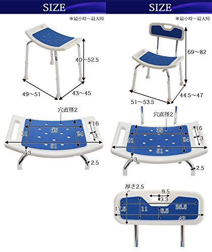 - 本体寸法: (背もたれなしタイプ)約49~51cm(幅)x約43~45cm(奥行)x約40~52.5cm(高さ) (背もたれ付きタイプ)約51~53.5cm(幅)x約44.5~47cm(奥行)x約69~82cm(高さ)