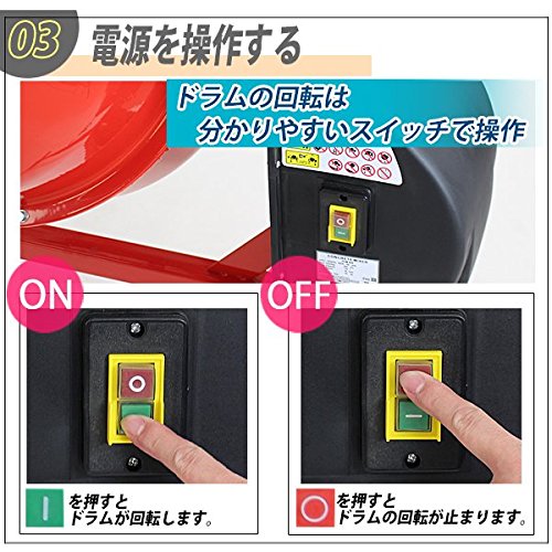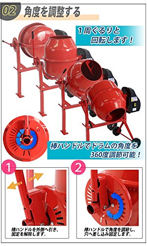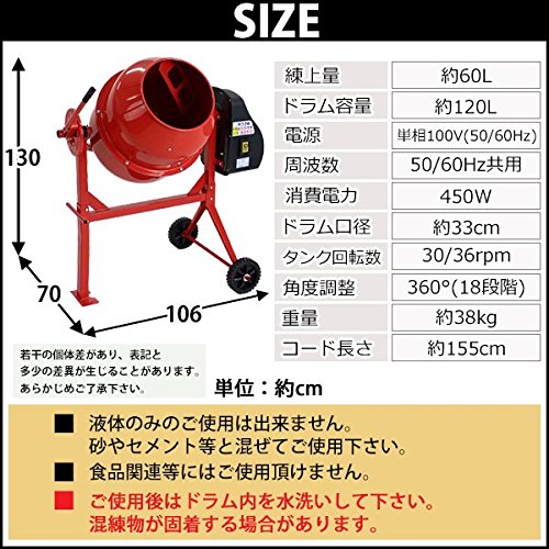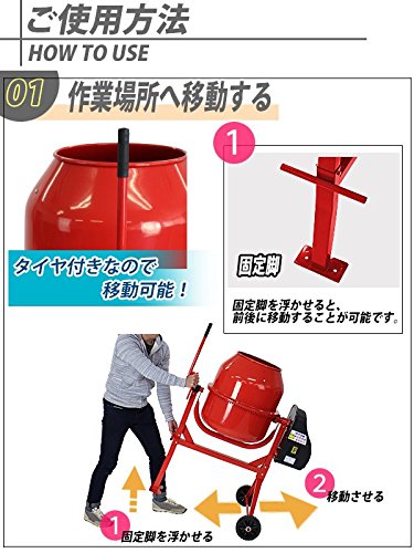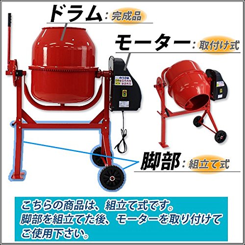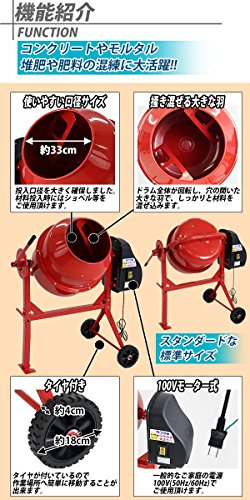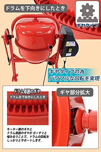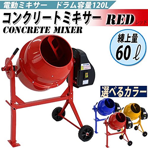 コンクリートミキサー 赤 練上量60L ドラム容量120L 電動 モーター式 100Vモーター 混練機 攪拌機 かくはん機 コンクリート モルタル 堆肥 肥料 飼料 園芸 タイヤ 車輪 キャスター ミキサー 攪拌 かくはん 混錬 混ぜる 練る レッド RED