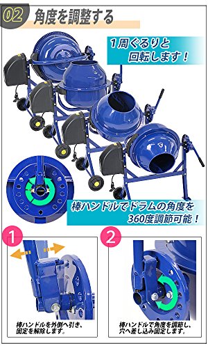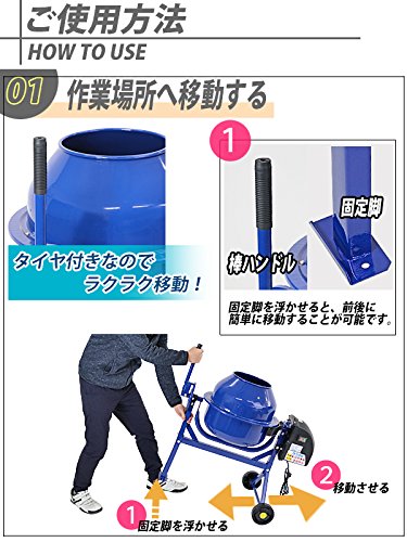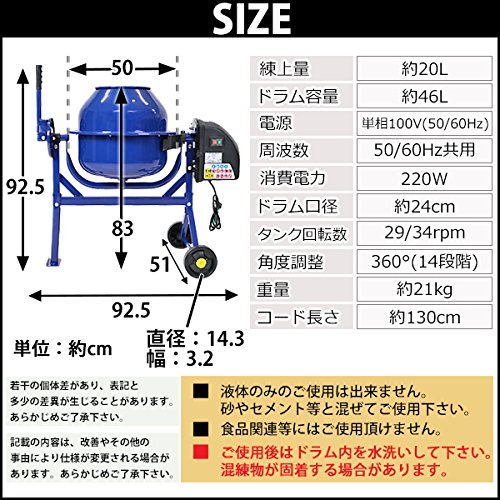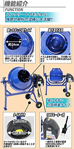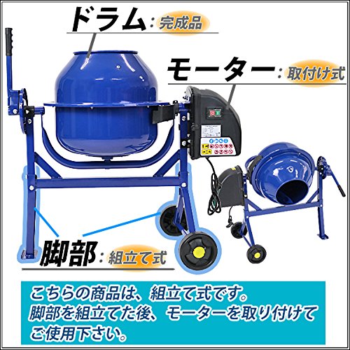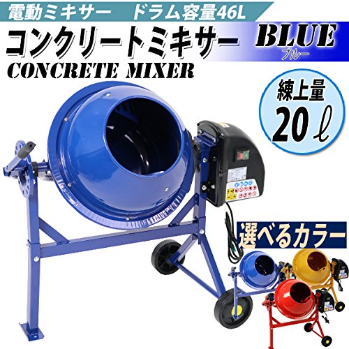 コンクリートミキサー 青 練上量20L ドラム容量46L 電動 モーター式 100Vモーター 混練機 攪拌機 かくはん機 コンクリート モルタル 堆肥 肥料 飼料 園芸 タイヤ 車輪 キャスター ミキサー 攪拌 かくはん 混錬 混ぜる 練る ブルー BLUE