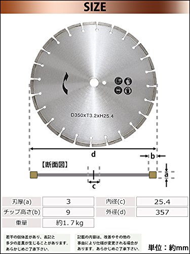 コンクリートカッター用ダイヤモンドブレード 単品 1枚 外径約357mm 14インチ 内径約25.4mm 穴径約25.4mm 刃厚約3mm ブレード コンクリートカッター アスファルトカッター 舗装カッター ダイヤモンドカッター 切断 道路 替え刃 替刃 交換 ccutterdb350blade