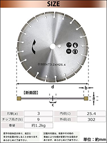コンクリートカッター用ダイヤモンドブレード 単品 1枚 外径約302mm 12インチ 内径約25.4mm 穴径約25.4mm 刃厚約3mm ブレード コンクリートカッター アスファルトカッター 舗装カッター ダイヤモンドカッター 切断 道路 替え刃 替刃 交換 ccutterdb300blade