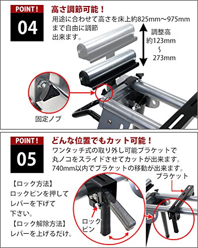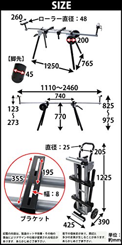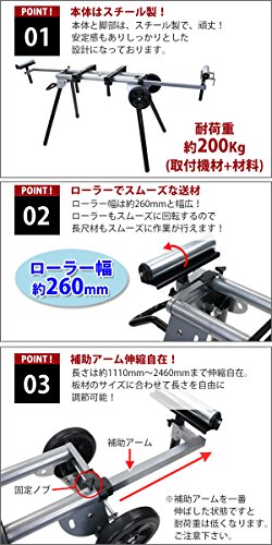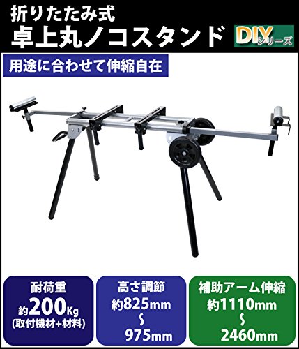 卓上丸ノコスタンド マルノコ 丸鋸 丸のこ 折りたたみ スライド 高さ調節 黒 カット 作業台 送材 ローラー幅約260mm 補助アーム伸縮約1110mm~2460mm 高さ約825mm~975mm 耐荷重約200kg DIY 日曜大工 裁断 切断 木工作業 コンパクト ブラック mitersawstandmt03bk