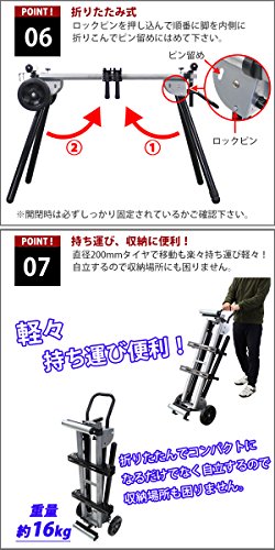 - 材質… スチール(本体、ローラー、ブラケット)、プラスチック(ブラケットレバー、固定ノブ)、PVC(ポリ塩化ビニル)(タイヤ)、PP(ポリプロピレン)(補助アームキャップ、タイヤホイール)