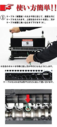 1:ケーブル(被覆線)の太さや形に応じて、適度な穴にケーブルを入れます。上部左右のボルトを回し、 刃がケーブル被覆に食い込む程度まで下げます(※)。