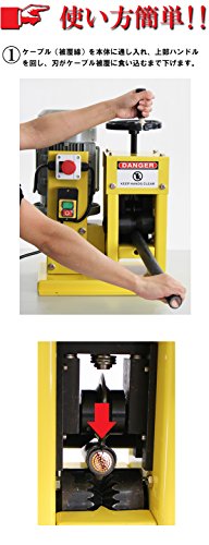 1:ケーブル(被覆線)を本体に通し入れ、上部ハンドルを回し、刃がケーブル被覆に食い込むまで下げます。