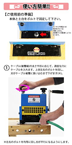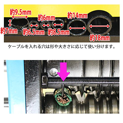 1:ケーブル(被覆線)の太さや形に応じて、適度な穴にケーブルを入れます。 上部左右のボルトを回し、 刃がケーブル被覆に食い込む程度まで下げます(※)。