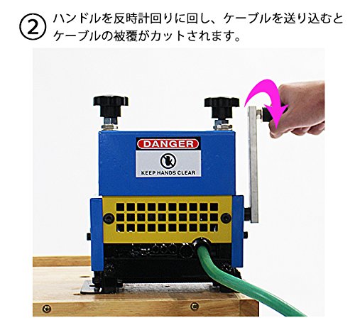 2:ハンドルを反時計回りに回し、ケーブルを送り込むと、ケーブルの被覆がカットされます。