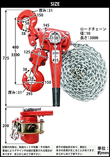 - 材質:スチール(本体)、合金鋼(ロードチェーン)、ラバー(グリップ)