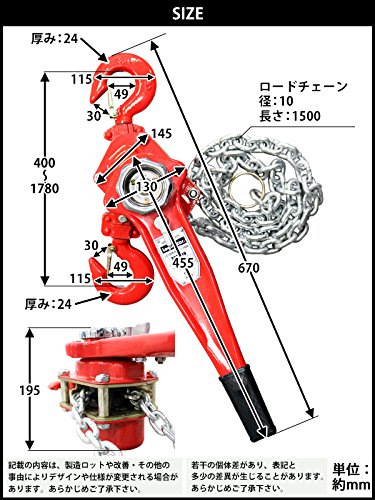 - 材質:スチール(本体)、合金鋼(ロードチェーン)、ラバー(グリップ)