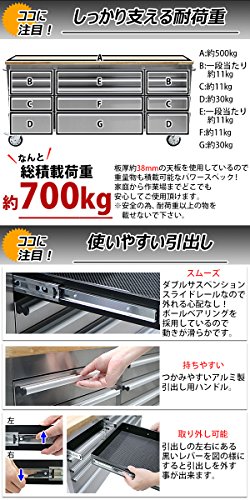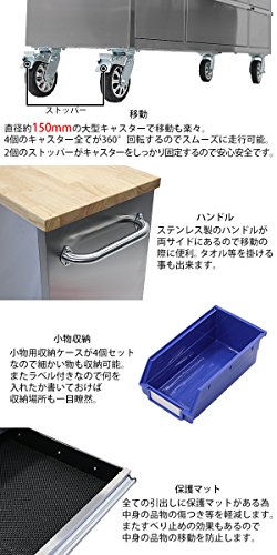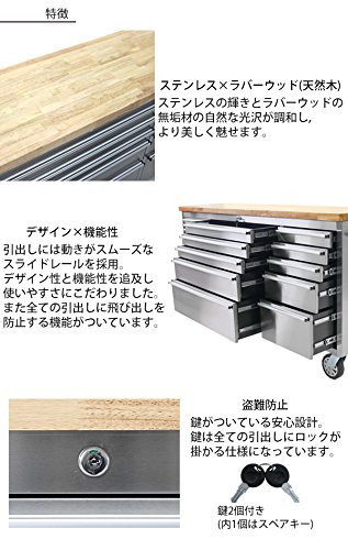 - 材質:ステンレス(本体、ハンドル[本体])、ラバーウッド(天板)、ゴム(キャスター)、アルミニウム(引出し用ハンドル)、EVA樹脂(保護マット)、プラスチック(小物ケース)