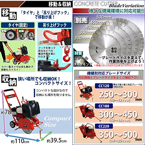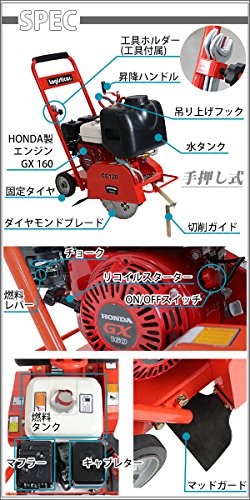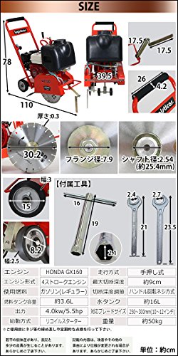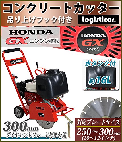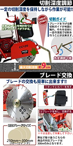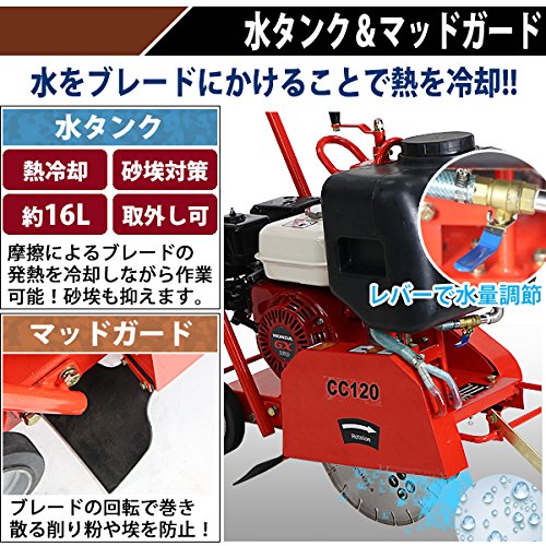 コンクリートカッター Honda GX160内蔵 4ストロークエンジン 5.5馬力 ダイヤモンドブレード付き 水タンク付き 切断深度約90mm 手押し式 アスファルトカッター 舗装カッター 切断機 コンクリート アスファルト 道路 切断 工事 舗装 ホンダ ccuttercc12db300
