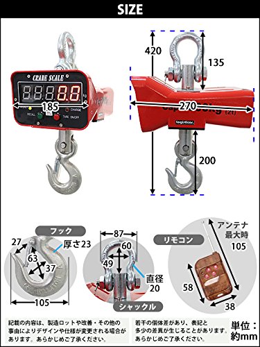 デジタルクレーンスケール 最大測定可能重量約2t リモコン付き 充電式 防水 防塵 精密 計量 無線 ワイヤレス 吊りはかり 吊り秤 吊秤 電子秤 吊り下げ クレーン フック 玉掛け 吊り上げ 重機 コンパクト 天秤 天びん はかり 2000kg 赤 レッド cscalecs2000red