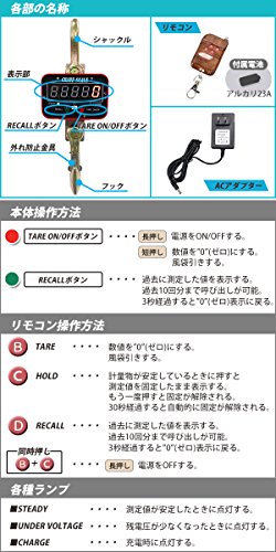 - 材質:アルミ合金(本体)、プラスチック(表示部、リモコン、ACアダプター)、スチール(シャックル、フック)、鉛蓄電池(バッテリー)