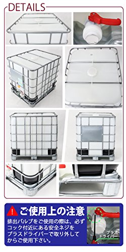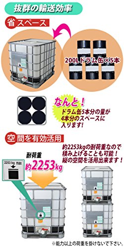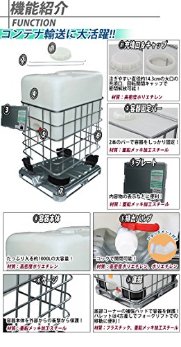 ■材質:高密度ポリエチレン(充填口キャップ、容器本体、排出バルブ)、亜鉛メッキ加工スチール(容器固定バー、プレート、ケージ、パレット)、プラスチック(容器底部コーナー補強パッド)