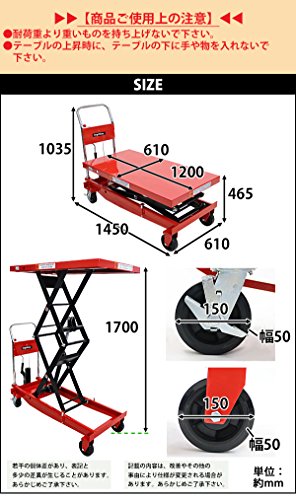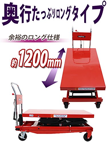 ◆油圧式 昇降台車◆ ■重量物を簡単に持ち上げることが出来る油圧式昇降台車です。 ■こちらの商品は高い場所への荷物の昇降に活躍する高床タイプと奥行たっぷりのロングタイプの特徴を兼ね備えております。 ■上昇用ペダルとハンドルレバーを使って高さを調節出来ます。 ■上昇用ペダルは一回の踏み込みで約20mm上昇します。 ■PUキャスター付きで移動もラクラク!後輪にはストッパー付き! ■主な仕様■ ■耐荷重:約500kg ■テーブルサイズ:W約610mm×D約1200mm ■本体重量:約154kg ■材質:スチール(本体)、PU(ポリウレタン)(キャスター)★ご購入前の注意事項★ ●こちらの商品は、ハンドル、上昇用ペダル部分を取り付ける組立て式になります。(組立てには6mmの六角棒レンチ,19mmのソケットレンチが必要です。お客様でご用意下さい。)(頑丈でとても重いので、組立て時には十分に注意をして行って下さい。)●こちらの商品は代金引換がご利用できません。ご注文時に代引き以外のお支払方法をお選び下さい。