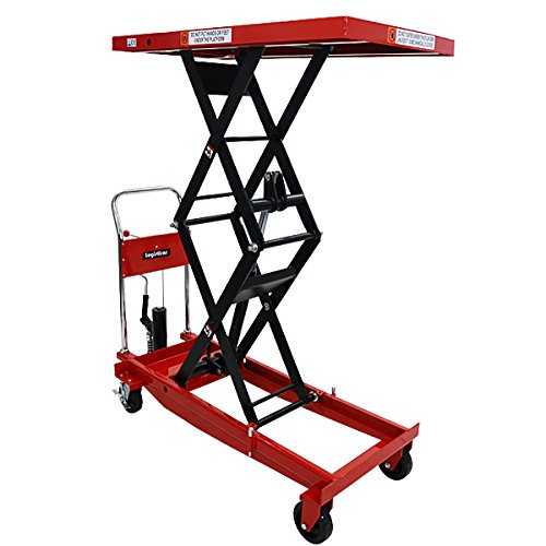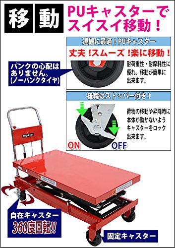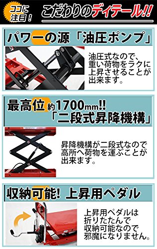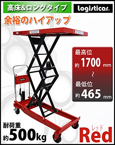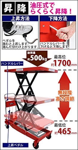 油圧式昇降台車 リフトカート テーブルカート ハンドリフター 高床 ロングタイプ 赤 最高位約1700mm 耐荷重約500kg 昇降台 油圧リフト 油圧台車 テーブルリフト リフティングテーブル 二段式 高揚程 ハイアップ 運搬台車 油圧 台車 レッド liftdaishasy50sr