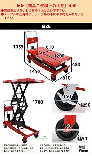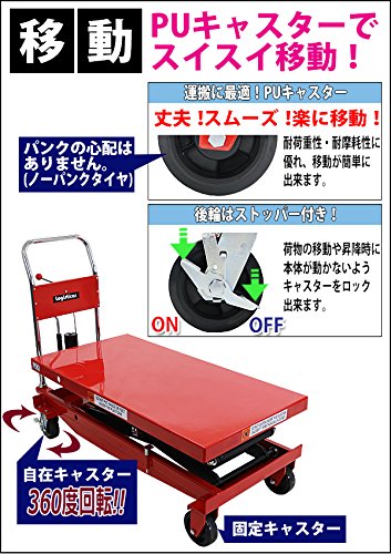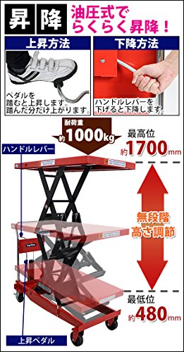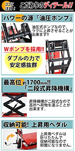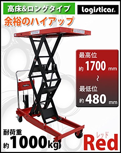油圧式昇降台車 リフトカート テーブルカート ハンドリフター 高床 ロングタイプ 赤 最高位約1700mm 耐荷重約1000kg 昇降台 油圧リフト 油圧台車 テーブルリフト リフティングテーブル 二段式 高揚程 ハイアップ 運搬台車 油圧 台車 レッド liftdaishasy100sr