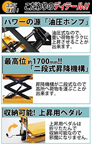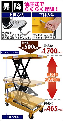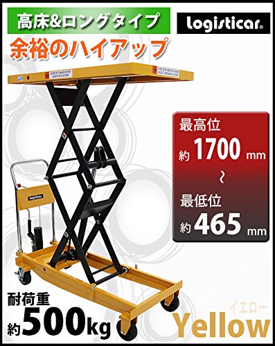 油圧式昇降台車 リフトカート テーブルカート ハンドリフター 高床 ロングタイプ 黄 最高位約1700mm 耐荷重約500kg 昇降台 油圧リフト 油圧台車 テーブルリフト リフティングテーブル 二段式 高揚程 ハイアップ 運搬台車 油圧 台車 イエロー liftdaishasy50sy