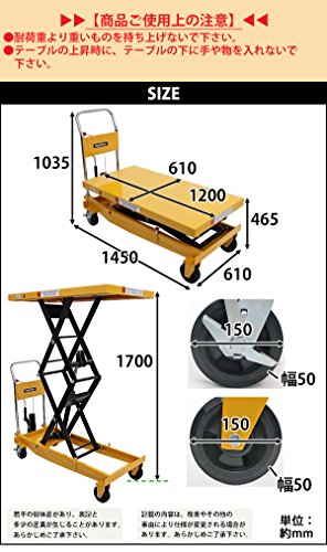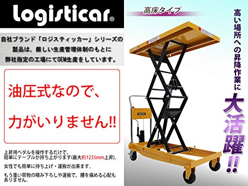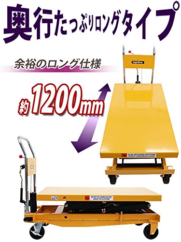 ◆油圧式 昇降台車◆ ■重量物を簡単に持ち上げることが出来る油圧式昇降台車です。 ■こちらの商品は高い場所への荷物の昇降に活躍する高床タイプと奥行たっぷりのロングタイプの特徴を兼ね備えております。 ■上昇用ペダルとハンドルレバーを使って高さを調節出来ます。 ■上昇用ペダルは一回の踏み込みで約20mm上昇します。 ■PUキャスター付きで移動もラクラク!後輪にはストッパー付き! ■主な仕様■ ■耐荷重:約500kg ■テーブルサイズ:W約610mm×D約1200mm ■本体重量:約154kg ■材質:スチール(本体)、PU(ポリウレタン)(キャスター) ★ご購入前の注意事項★ ●こちらの商品は、ハンドル、上昇用ペダル部分を取り付ける組立て式になります。(組立てには6mmの六角棒レンチ,19mmのソケットレンチが必要です。お客様でご用意下さい。)(頑丈でとても重いので、組立て時には十分に注意をして行って下さい。)●こちらの商品は代金引換がご利用できません。ご注文時に代引き以外のお支払方法をお選び下さい。