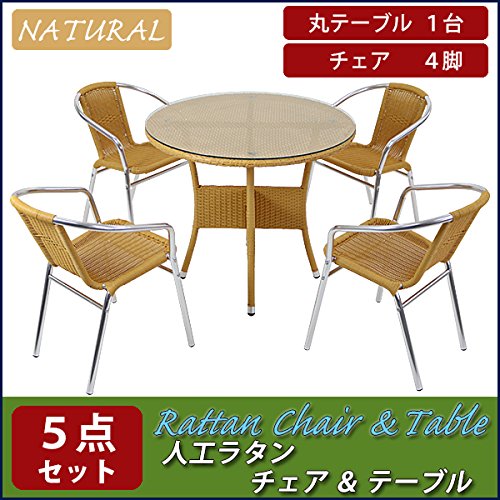 人工ラタンチェア4脚 丸テーブル1台 5点セット 強化ガラス ナチュラル 籐 肘掛け付き 家具 ファニチャー インテリア スタッキングチェア リビング chair 椅子 南国 アジアン バリ風 リゾート ホテル ベランダ バルコニー 庭 ガーデン rattan2459t5setna