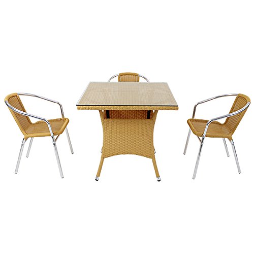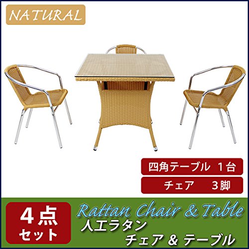 人工ラタンチェア3脚 四角テーブル1台 4点セット 強化ガラス ナチュラル 籐 肘掛け付き 家具 ファニチャー インテリア スタッキングチェア リビング chair 椅子 南国 アジアン バリ風 リゾート ホテル ベランダ バルコニー 庭 ガーデン rattan2465t4setna