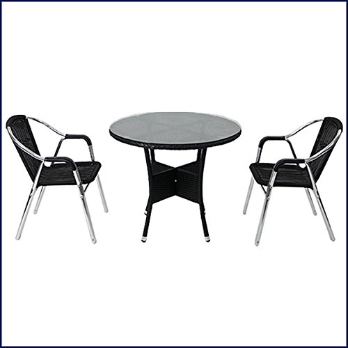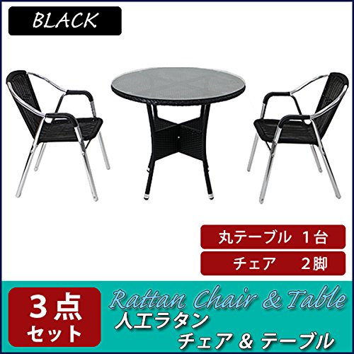 人工ラタンチェア2脚 丸テーブル1台 3点セット 強化ガラス ブラック 籐 肘掛けカバー付き 家具 ファニチャー インテリア スタッキングチェア リビング chair 椅子 南国 アジアン バリ風 リゾート ホテル ベランダ バルコニー 庭 ガーデン 黒 rattan1759t3setbk