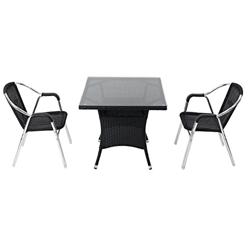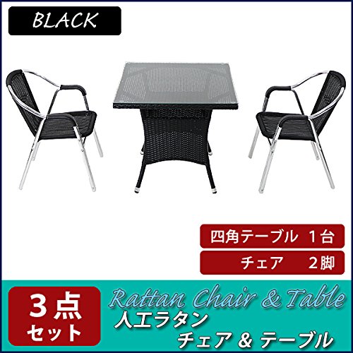 人工ラタンチェア2脚 四角テーブル1台 3点セット 強化ガラス ブラック 籐 肘掛けカバー付 家具 ファニチャー インテリア スタッキングチェア リビング chair 椅子 南国 アジアン バリ風 リゾート ホテル ベランダ バルコニー 庭 ガーデン 黒 rattan1765t3setbk