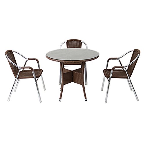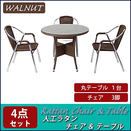 人工ラタンチェア3脚 丸テーブル1台 4点セット 強化ガラス ウォールナット 籐 肘掛けカバー付き 家具 ファニチャー インテリア スタッキングチェア リビング chair 椅子 南国 アジアン バリ風 リゾート ホテル ベランダ バルコニー 庭 rattan1759t4setwa