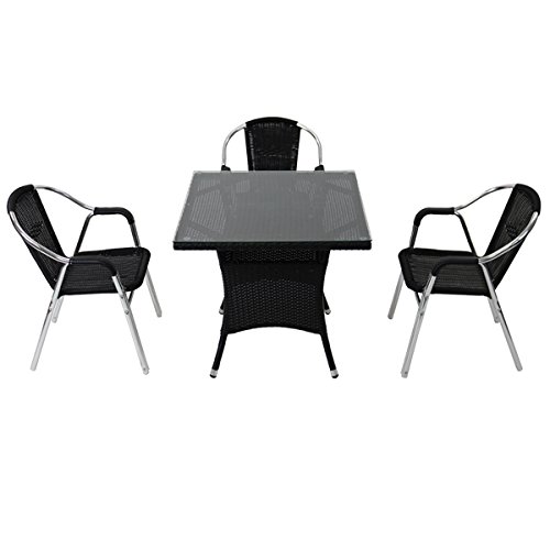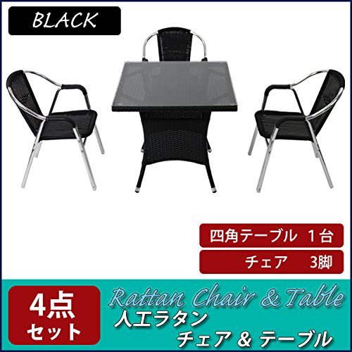 人工ラタンチェア3脚 四角テーブル1台 4点セット 強化ガラス ブラック 籐 肘掛けカバー付 家具 ファニチャー インテリア スタッキングチェア リビング chair 椅子 南国 アジアン バリ風 リゾート ホテル ベランダ バルコニー 庭 ガーデン 黒 rattan1765t4setbk