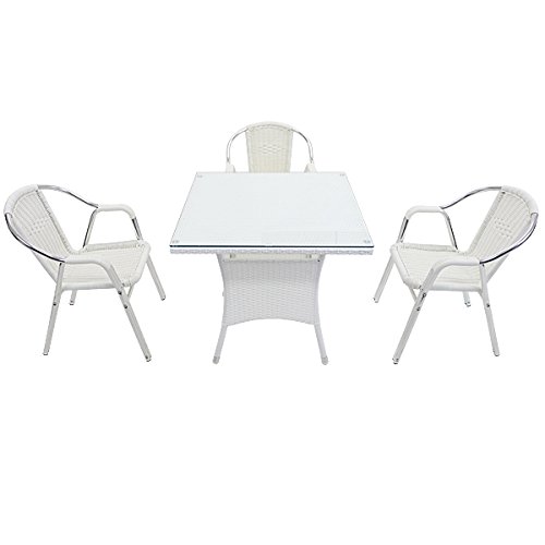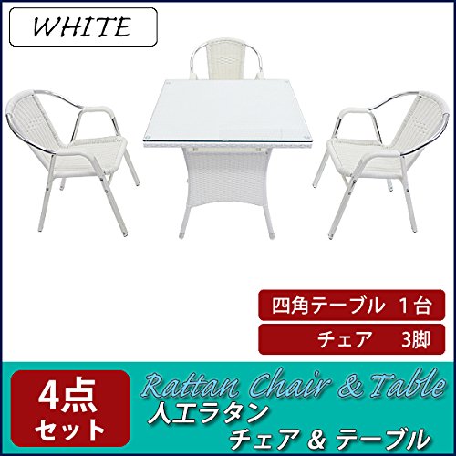 人工ラタンチェア3脚 四角テーブル1台 4点セット 強化ガラス ホワイト 籐 肘掛けカバー付 家具 ファニチャー インテリア スタッキングチェア リビング chair 椅子 南国 アジアン バリ風 リゾート ホテル ベランダ バルコニー 庭 ガーデン 白 rattan1765t4setwh
