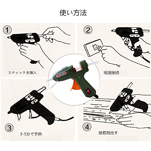 - 2-3分で熱くなり、自動で一定の温度を保つため、金属、木材、カード、布、プラスチック、陶器などを利用した、ご家庭やオフィス、学校でのDIYクラフト作成に理想的な接着器具としてご利用いただけます