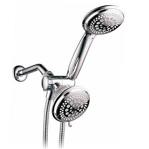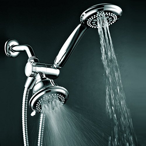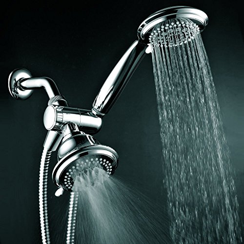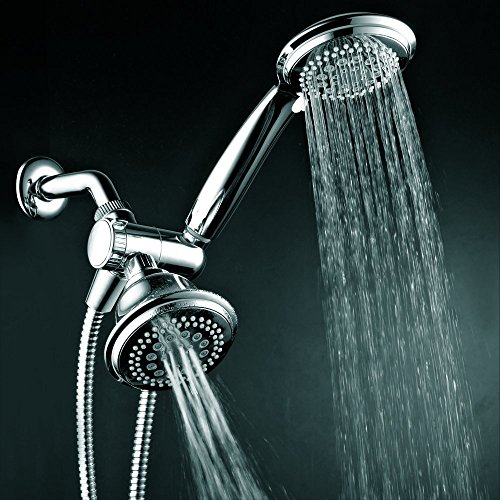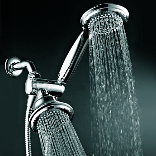 - Dual Shower Head System Includes a 7-setting 4-inch Shower Head, a 7-setting 4-inch Handshower, Patented 3-way Water Diverter with Anti-swivel Lock Nut, Angle-Adjustable Overhead Bracket, and 5 Foot Stainless Steel Shower Hose