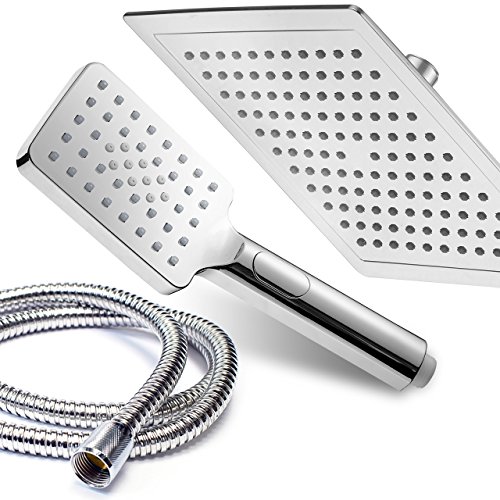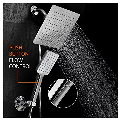 - NEW RAINFALL SHOWER COMBO WITH PUSH-BUTTON CONTROL FLOW CONTROL: Use luxurious rainfall shower head for drenching Rainfall Showerhead, or pamper with new state-of-the-art hand shower featuring convenient push-button flow control Hold the Handheld Shower and switch its flow settings with the same hand! No dial to turn, SIMPLY PUSH THE FLOW-CONTROL BUTTON with your thumb!